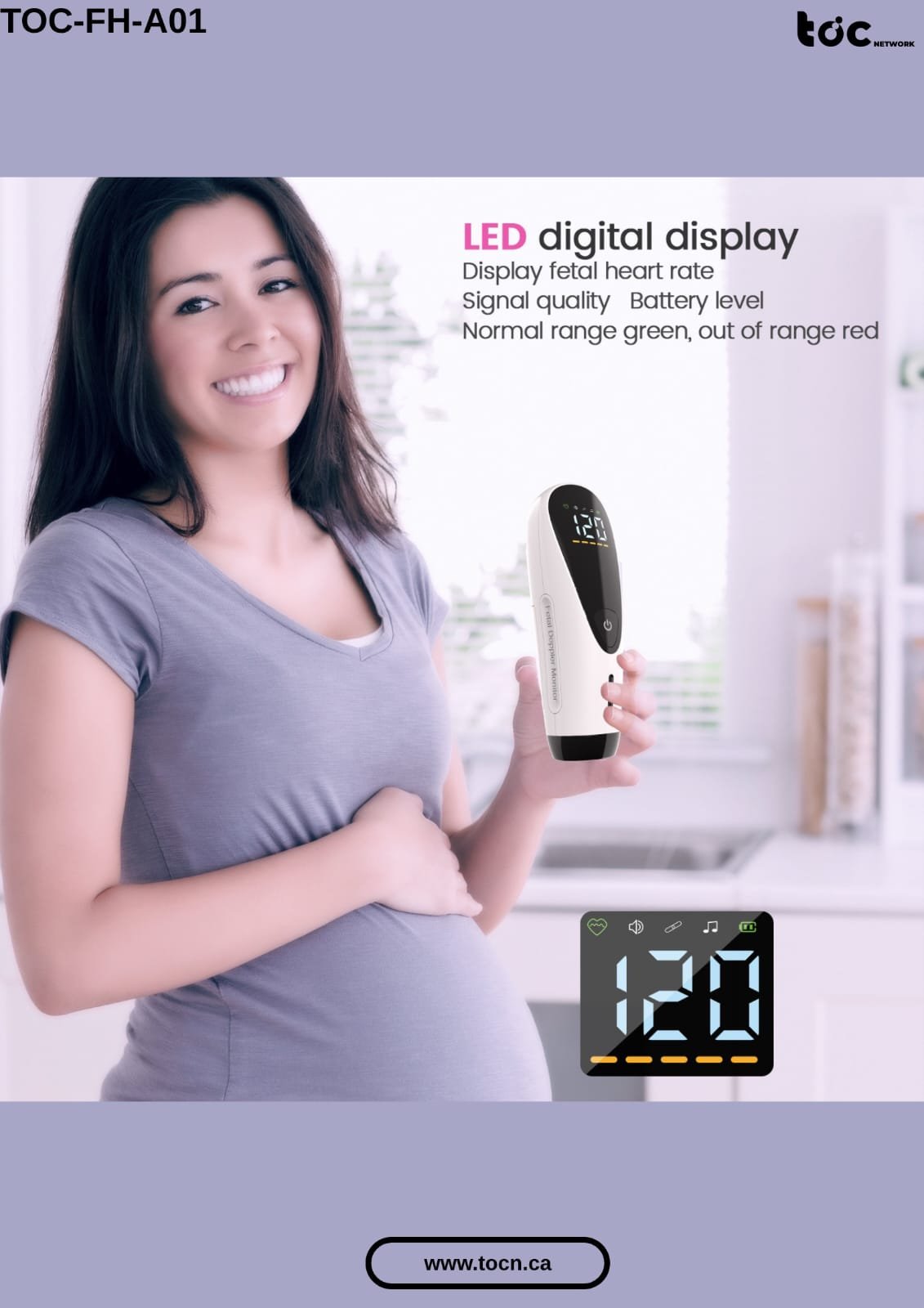 LED Digital Display, displays fetal heart rate, high signal quality, battery level indicator, normal range green: out of range red.